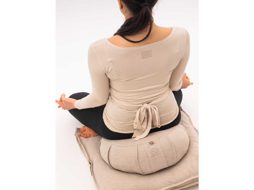 Na zádech je decentně tištěná mantra „Lokah Samastah Sukhino Bhavantu“, tradiční přání štěstí, harmonie a svobody pro všechny bytosti. Dodává tričku jedinečnou energii a jemný spirituální nádech, který ocení zejména milovnice jógové filosofie.
