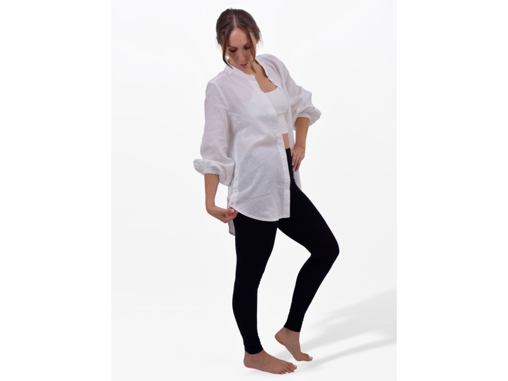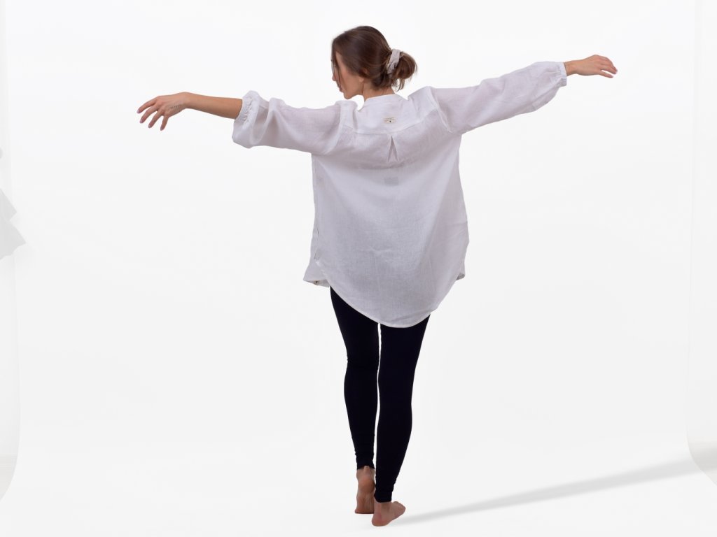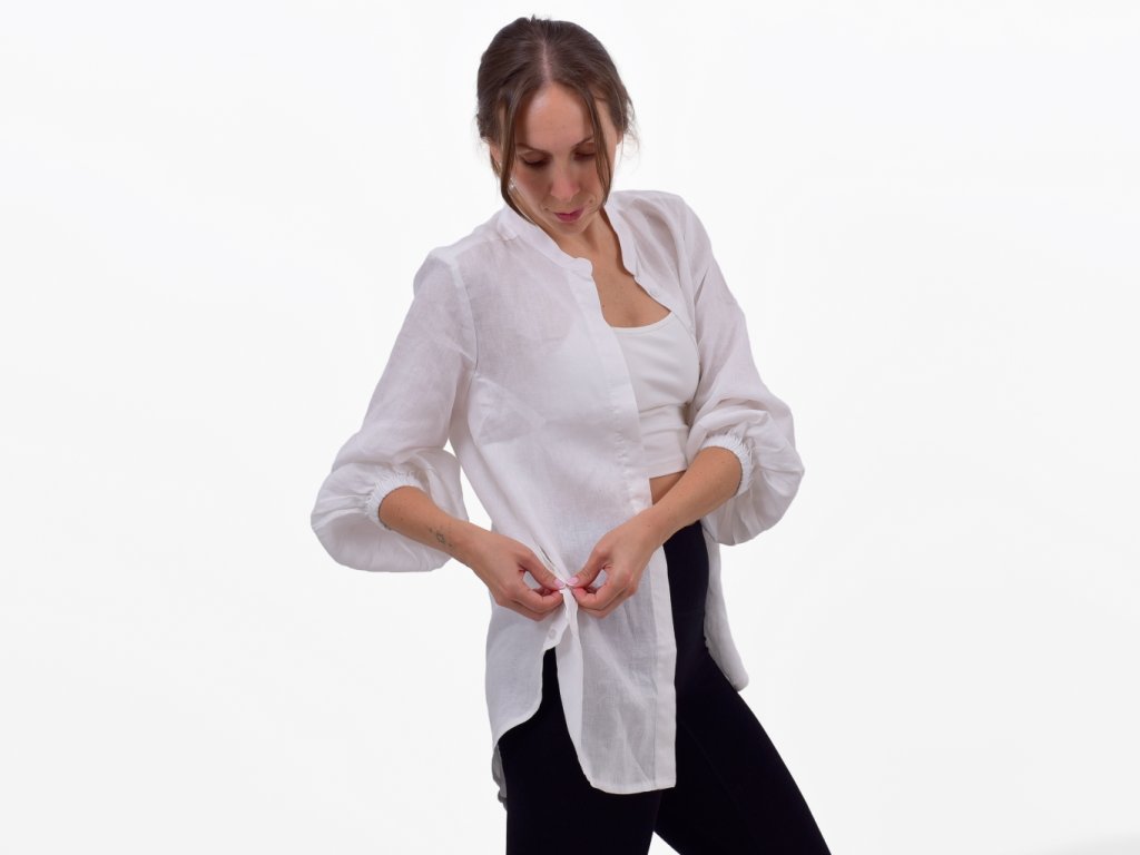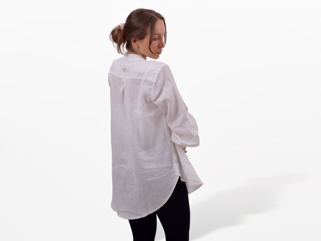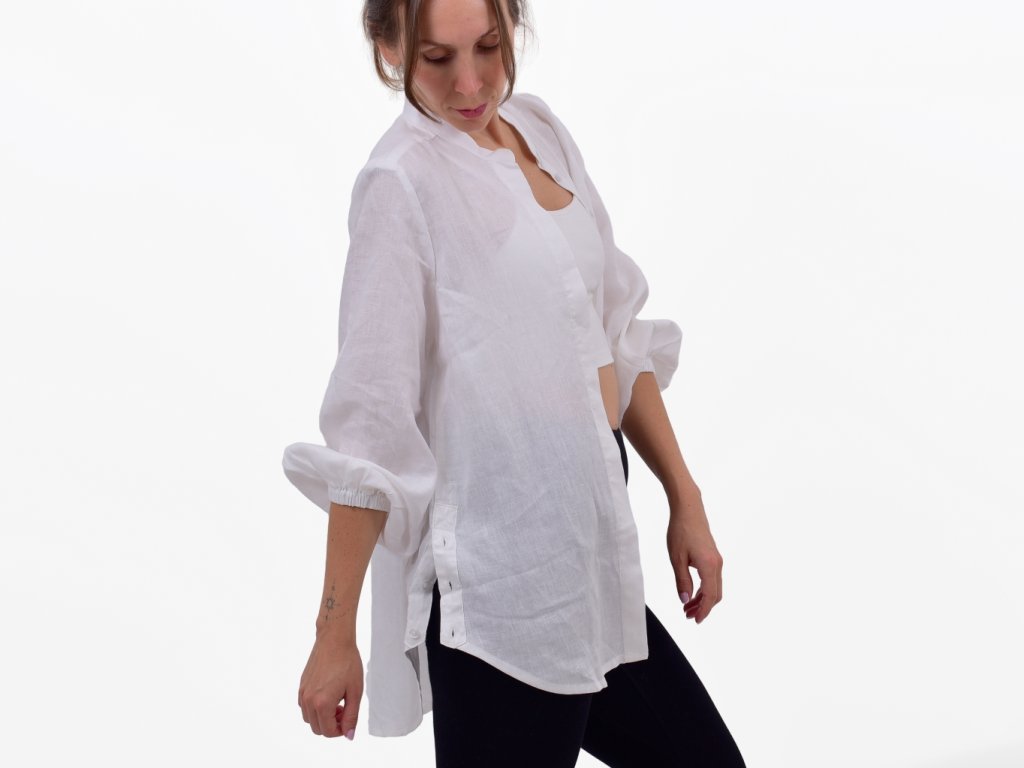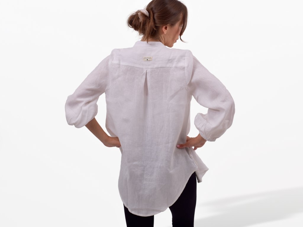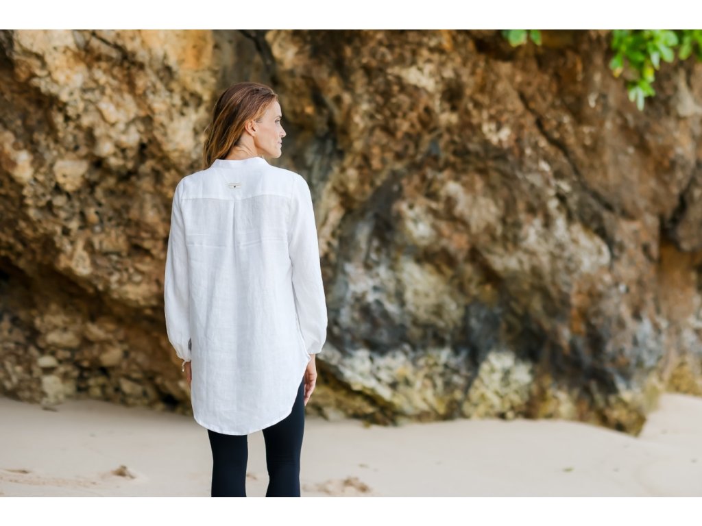 Elegantní, vzdušná a nadčasová – taková je tato bílá dámská lněná košile bez límečku, navržená pro ženy, které hledají pohodlí, kvalitu a smysl.