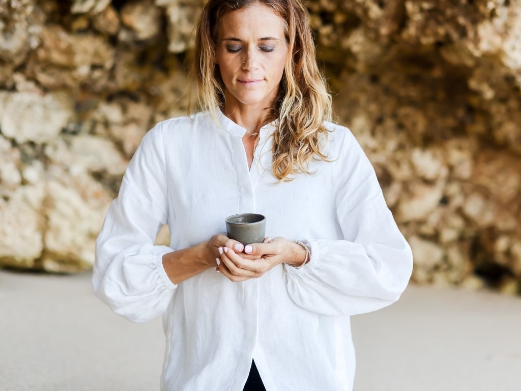 Volný, neformální střih s 3/4 rukávy umožňuje naprostou svobodu pohybu – skvělé nejen pro běžné nošení, ale i jako součást jógového outfitu či meditace.