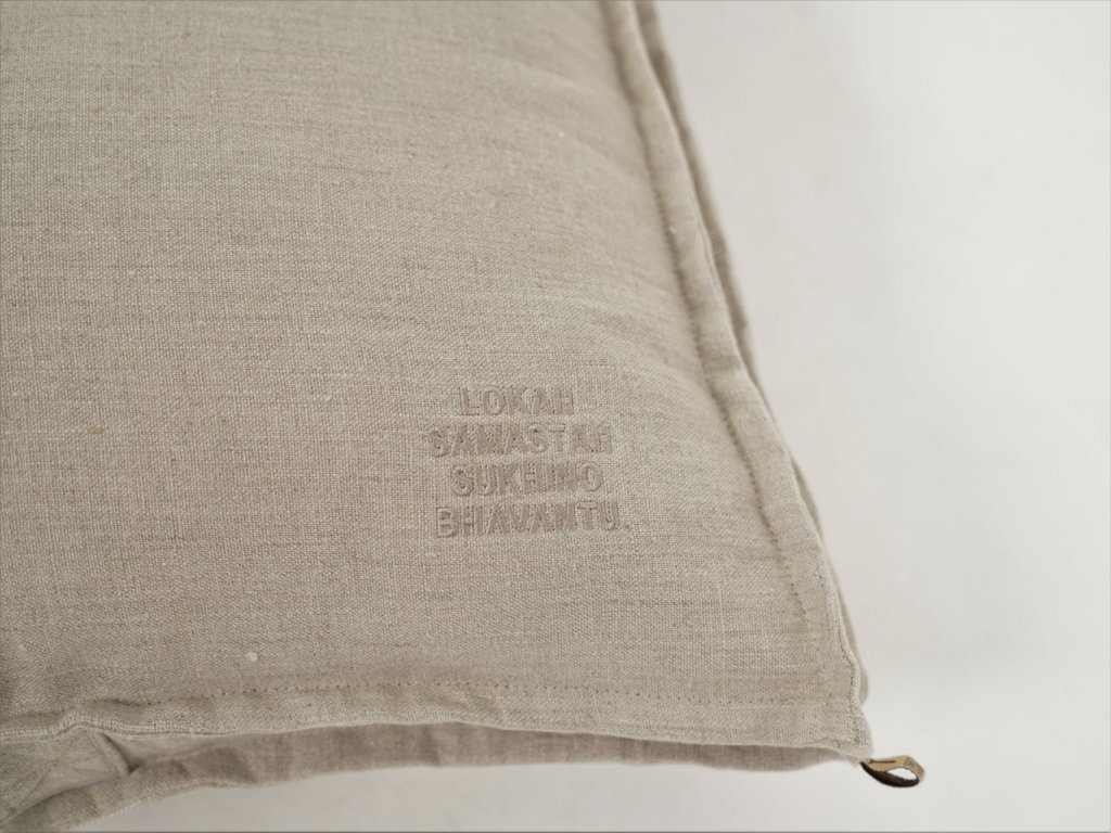 Minimalistický design doplňuje jemná výšivka mantry „Lokah Samastah Sukhino Bhavantu“ – tiché přání klidu a harmonie pro všechny bytosti.